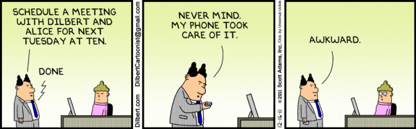 Dilbert comic strip for 2011-12-16: Smartphone listening in when Pointy Haired Boss asks Carol to make an appointment