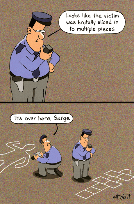 “Looks like the victim was brutally sliced in to multiple pieces”; “It’s over here, Sarge” Humorous cartoon by award winning Australian artist Tim Whyatt.
