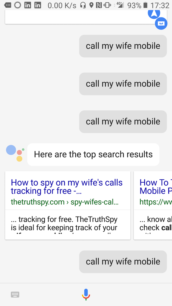 • totally misses the alias (so when asking to call my wife mobile, it sometimes presents search results, for instance on “How to spy on my wife’s calls tracking for free”)