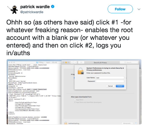 Via: [Archive.is] Mike Myers‏ @fristle: Perhaps nobody noticed two weeks ago when the root login vulnerability in macOS High Sierra was shared as a helpful tip on Apple’s own Developer forums. https://forums.developer.apple.com/thread/79235