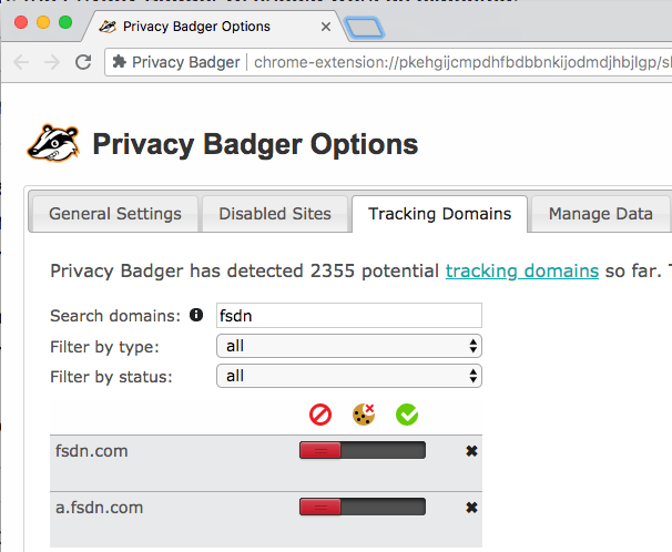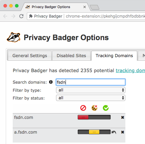 Not sure why Privacy Badger blocked both fsdn.com and a.fsdn.com (if someone knows how to find that out: please let me know), but these are CDN domains are used by Slashdot and sf.net, so I have put a.fsdn.com from red to yellow (no cookies).