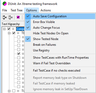 SetUp or TearDown for that suite level\ backslash or / forward slash in test suite names (which is unwise because a lot of tooling sees those as suite hierarchy separators)function TestSuite(AName: string; const Tests: array of ITest): ITestSuite;procedure RegisterTest(SuitePath: string; test: ITest); overload;procedure RegisterTest(test: ITest); overload;procedure RegisterTests(SuitePath: string; const Tests: array of ITest); overload;procedure RegisterTests(const Tests: array of ITest); overload;function RegisteredTests: ITestSuite;procedure TTestSuite.LoadConfiguration(const iniFile: TCustomIniFile; const section: string);procedure TTestSuite.SaveConfiguration(const iniFile: TCustomIniFile; const section: string);DUnit.iniDUnit.ini file will be saved after the GUI tests are run (overwriting any changes) when the Auto Save Configuration is enabled (which is the default)