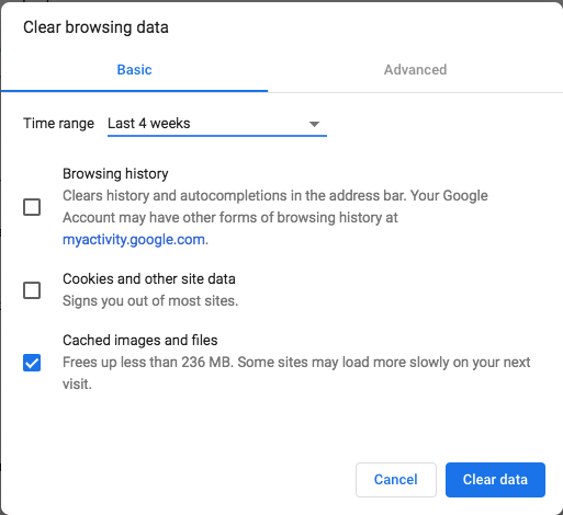 chrome://settings/clearBrowserData to clear Chrome browser cache