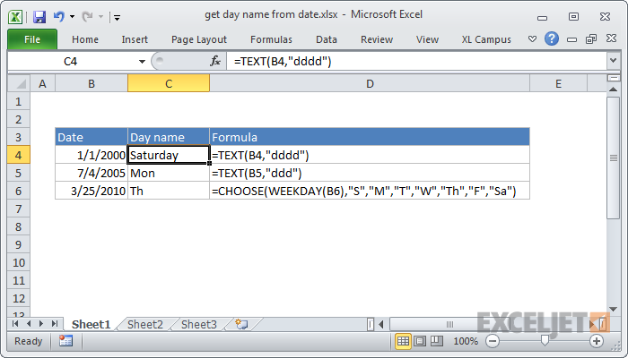 2. =TEXT(B4,"dddd") gives you the full day name of B4 in your locale