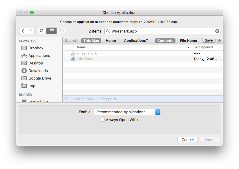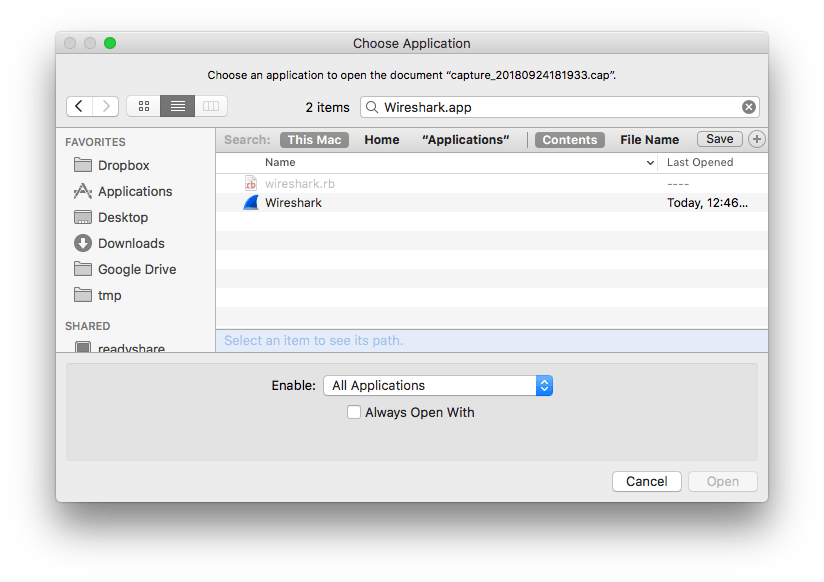 Then you can select “Wireshark.app”: