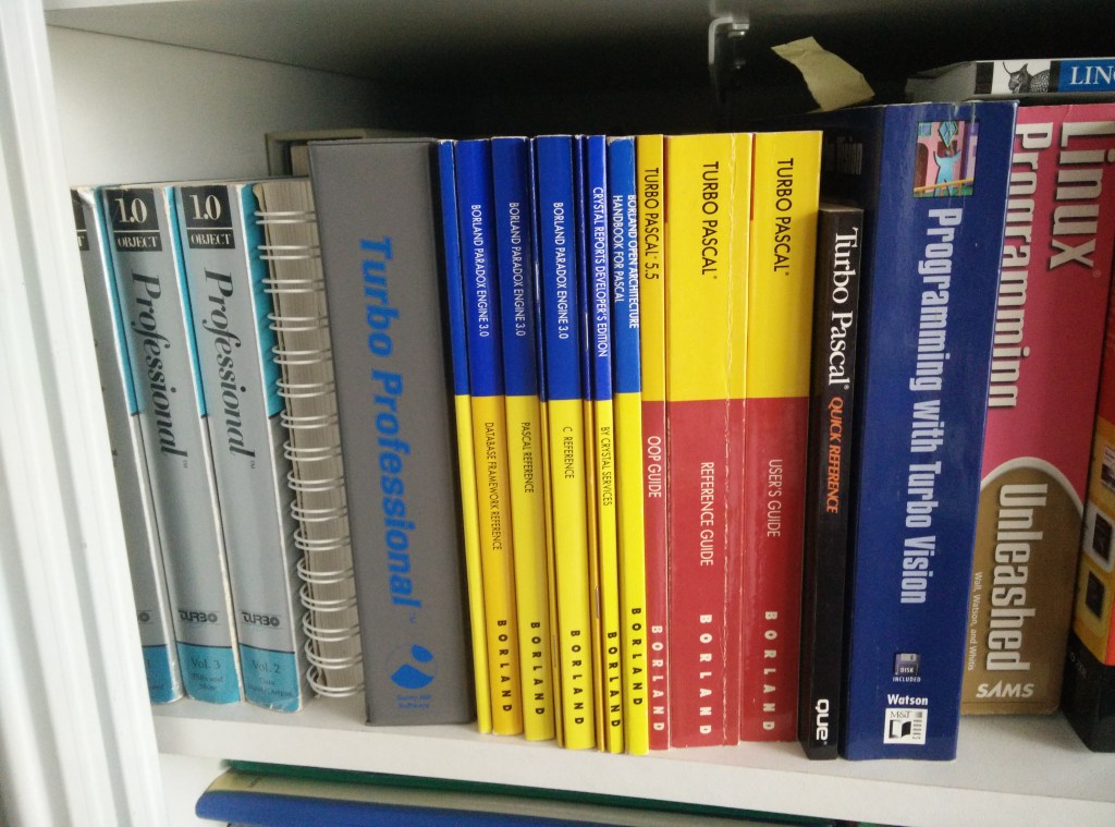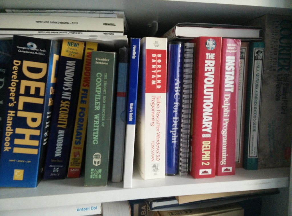 This is just a tiny part of my Bookshelf related to Delphi and Turbo Pascal. The shelves are 3 books deep, so hopefully in the future, there is much more to cover (: