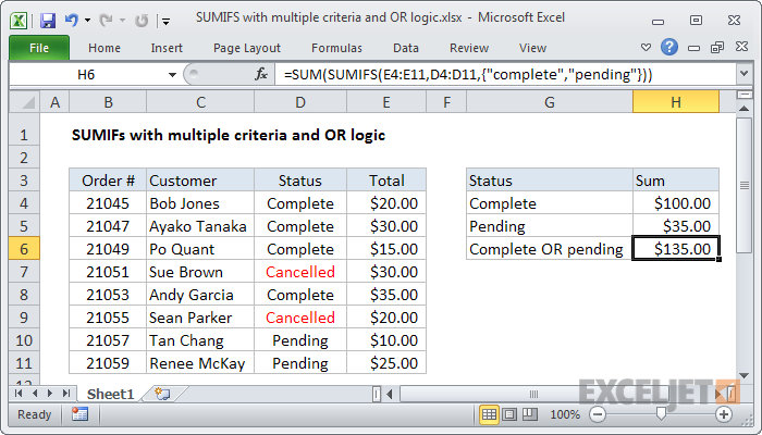 =SUM(SUMIFS(E4:E11,D4:D11,{"complete","pending"}))