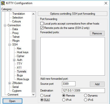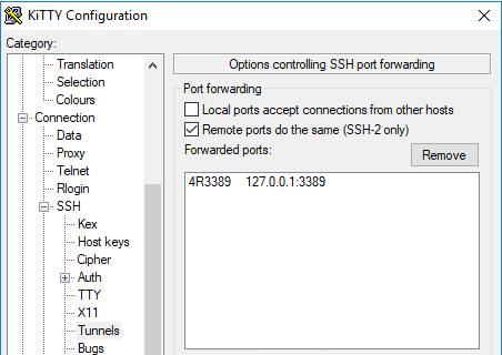 - tick “Remote ports do the same (SSH-2 only)”