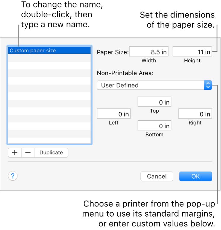 If you want to create a document that has a unique size, such as an envelope or card, first see if the paper size appears in the Paper Size pop-up menu. If not, you can create your own custom paper size. Custom paper sizes aren’t available for some printers or for all apps.