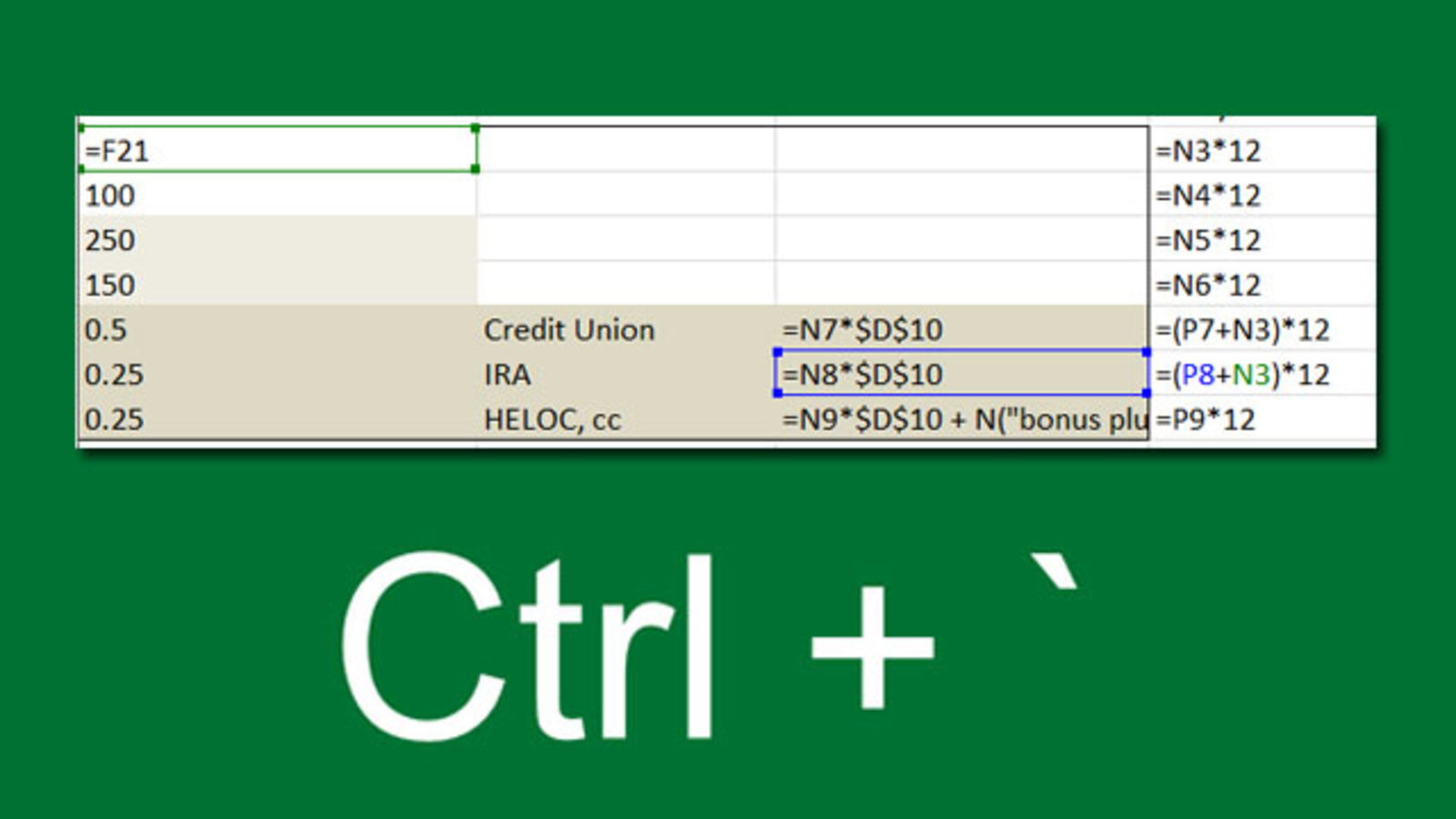 Toggle between regular view and view all formulas in a worksheet via [WayBack] Quickly See All the Formulas in Excel with This Shortcut which I wish I had known years ago: