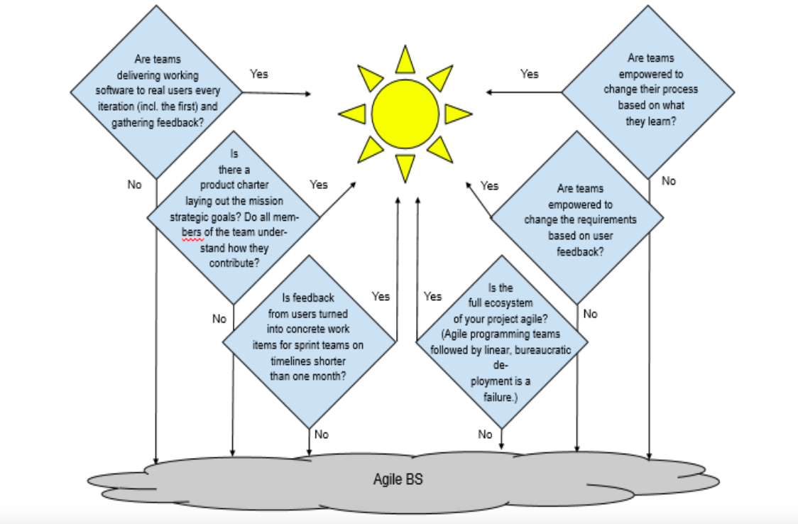 From a while back, but still one of the easiest flow charts to see if your organisation really works in an agile way: “graphical flow chart for separating agile from agile BS”