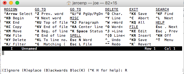 The built-in help of the Joe’s Own Editor – Wikipedia shows only a limited set of keyboard shortcuts: