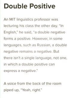There has been an anecdote going around on the internet (I bumped into it via [WayBack] Giggles #giggles #linguistics – Terry McNeil – Google+) about an MIT linguistics professor on double positives not becoming a negative, but somehow do.
