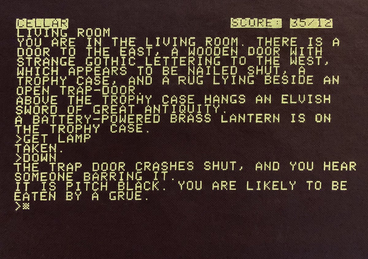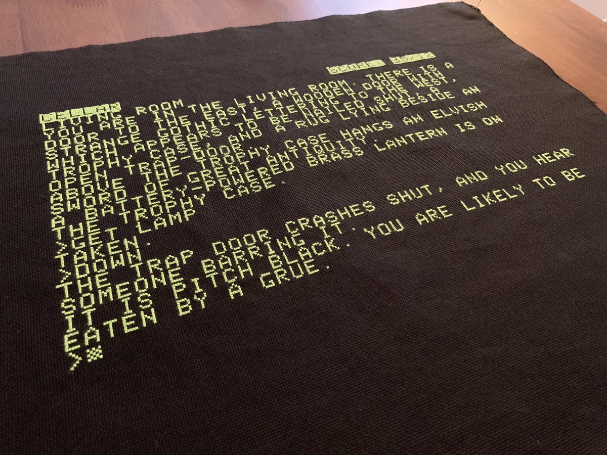 This is so cool: [WayBack] Glenda 🐰 on Twitter: “You are likely to be eaten by a grue! Just finished a new #NerdStitch cross stitch project- Zork 1 (Apple II version). The second adventure game I ever played. #zork #EatenByAGrue #apple2 #Infocom” .