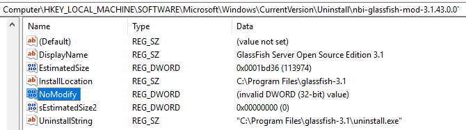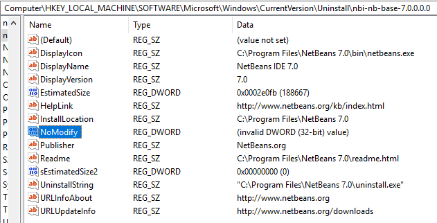Yep, I can see this problem as well. I believe the problem (bug) has indeed always existed. What happens is that someone (in this case NetBeans Installer) has put an 8-byte value into a Registry field that should only contain a 4-byte value. DWORDs are 4-byte. If you use Registry Editor you can clearly see the problem if you look at something NBI has installed. You must look under either HKEY_LOCAL_MACHINE\SOFTWARE\Microsoft\Windows\CurrentVersion\Uninstall (64-bit installers) or HKEY_LOCAL_MACHINE\SOFTWARE\Wow6432Node\Microsoft\Windows\CurrentVersion\Uninstall (32-bit installers). For some reason I don't see the problem for those NBI applications installed with a 32-bit installer, meaning the stuff in HKEY_LOCAL_MACHINE\SOFTWARE\Wow6432Node\Microsoft\Windows\CurrentVersion\Uninstall. This can probably be explained when you read the next bit. NBI actually sets a number of Registry key values but all of them are strings, with the exception of NoModify value. As far as I know this value already defaults to true (=1) if not present so the fact that Windows cannot interpret what NBI has put into the Registry does not have much effect .... until all other kinds of tools will start to explain as you've encountered. So, what's the problem? As far as I can see this is really just a very simple bug. In the NBI project (NetBeans Platform source) you have a file called jni_WindowsRegistry.c which defines various JNI methods that can then be used from within Java. One of these is called 'set32BitValue0(....)'. It looks like this: JNIEXPORT void JNICALL Java_org_netbeans_installer_utils_system_windows_WindowsRegistry_set32BitValue0(JNIEnv *jEnv, jobject jObject, jint jMode, jint jSection, jstring jKey, jstring jName, jint jValue) { unsigned short* key = getWideChars(jEnv, jKey); unsigned short* name = getWideChars(jEnv, jName); DWORD dword = (DWORD) jValue; LPBYTE byteValue = (LPBYTE) &dword; if (!setValue(getMode(jMode),getHKEY(jSection), key, name, REG_DWORD, byteValue, sizeof(name), 0)) { throwException(jEnv, "Cannot set value"); } FREE(key); FREE(name); } One of the parameters passed to the setValue() function is the size (bytes) of the value. Unfortunately whoever made this has made a blunder by using 'sizeof(name)' for that parameter. It should have been the size of the value, not the size of the name, meaning sizeof(dword) or just a hard-coded value of 4. Just imagine what sizeof(name) will give you if name happens to be 'NoModify'. Yep, that's right: It will be 8. As I said, I believe this blunder has been in the code from the very beginning. It just hasn't had much effect until now.