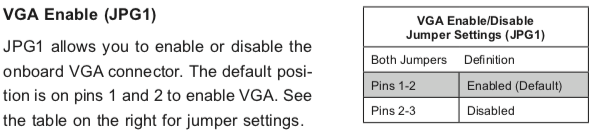 JPG1 allows you to enable or disable the onboard VGA connector. The default position is on pins 1 and 2 to enable VGA.
