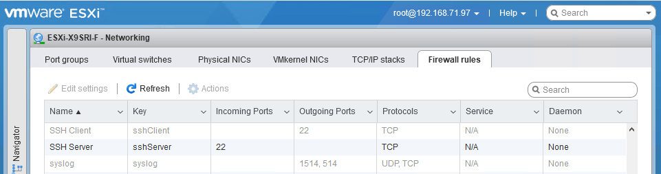 [root@ESXi-X9SRI-F:~] esxcli network firewall ruleset list --ruleset-id sshClient