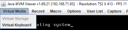 The “Virtual Storage” menu item under “Virtual Media” was marked grey (gray?) as being unavailable.