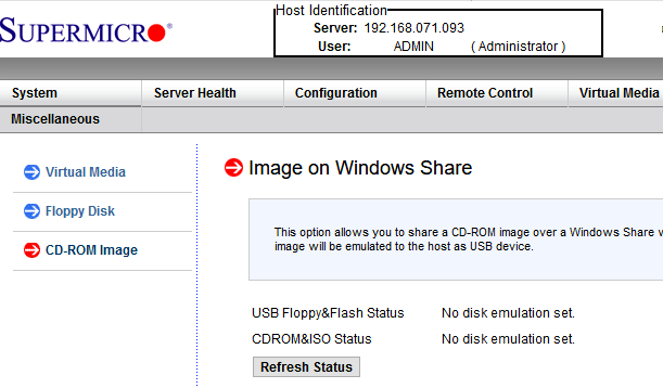 Despite that, no disk image was shown mounted according to the web interface at menu path “Virtual Media” -> “CD-ROM Image“: