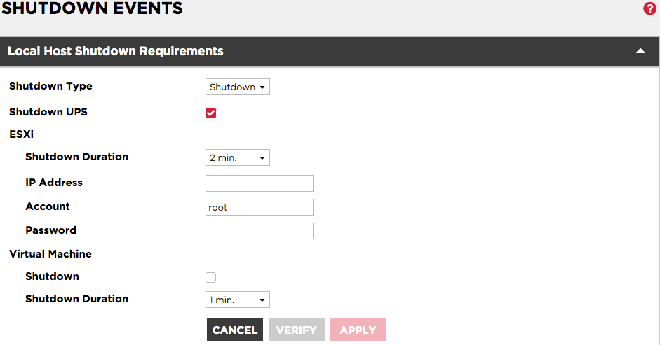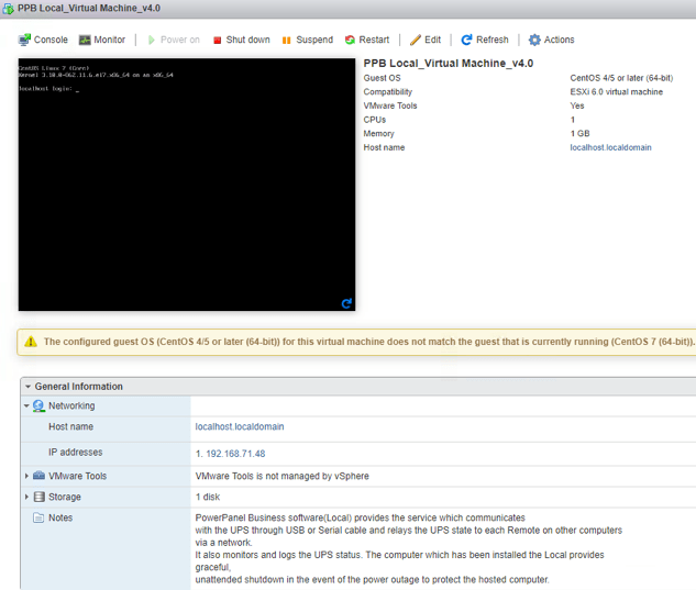 VMware vSphere ESXi VM requirements: CPU: 1; Memory: 2G; Disk: 20G; Virtual Appliance OS: CentOS; OS Username/Password: admin/admin; PowerPanel® Software Username/Password: admin/admin.