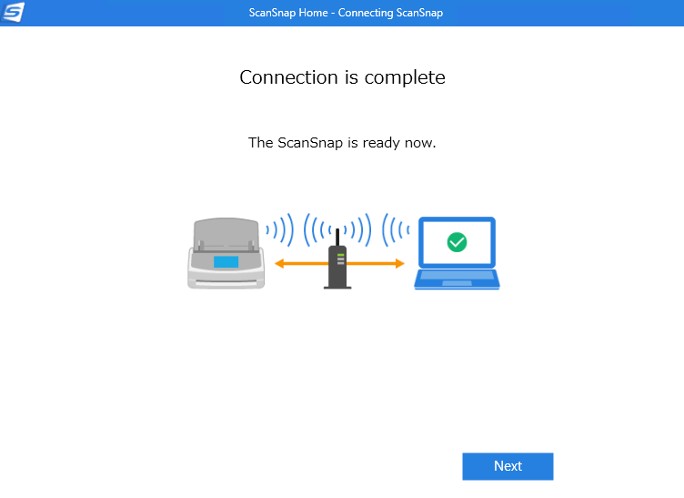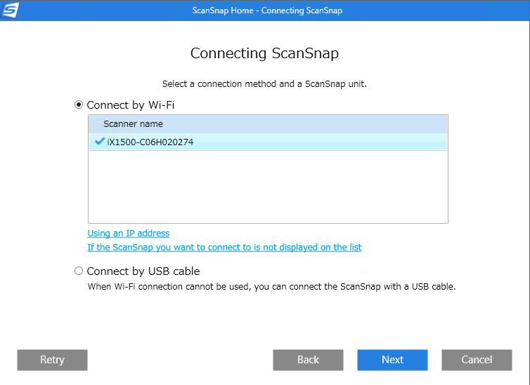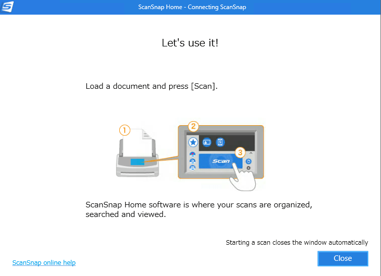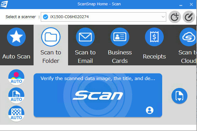 After this, the “ScanSnap Home – Scan” screen connects and you can use that in addition to the touch screen to scan: