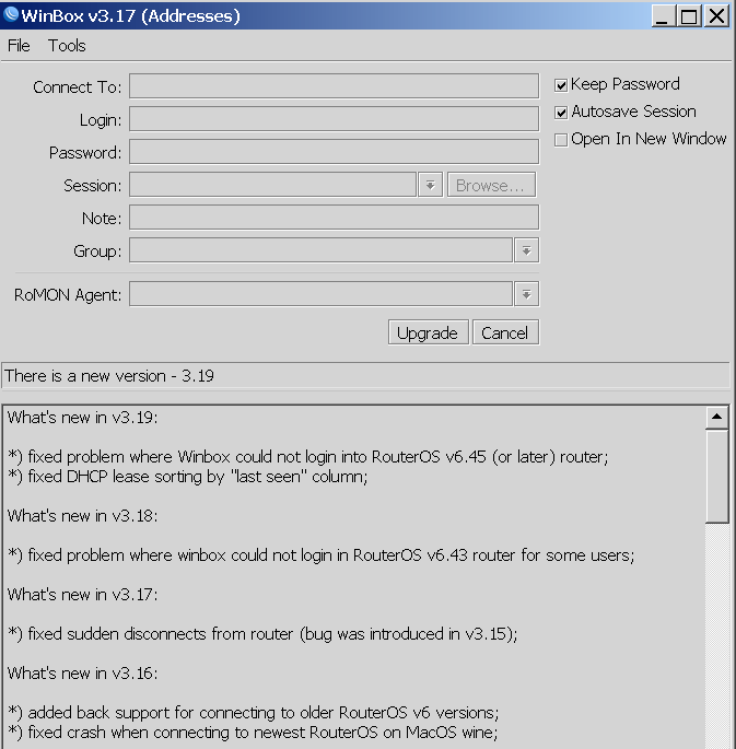 *) fixed crash when connecting to newest RouterOS on MacOS wine; - [WayBack] Winbox 3.19 login problem – MikroTik