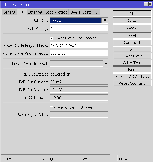 /interface ethernet set [ find default-name=ether5 ] comment="RaspberryPi" poe-out=\ forced-on power-cycle-ping-address=192.168.124.38 power-cycle-ping-enabled=\ yes power-cycle-ping-timeout=2m