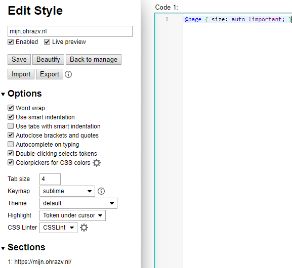 I reconfigured the OHRA Mijn Zorg site to force re-enabling of layout by adding @page { size: auto !important; } for https://mijn.ohrazv.nl/ (click the Save button to save this change permanently):