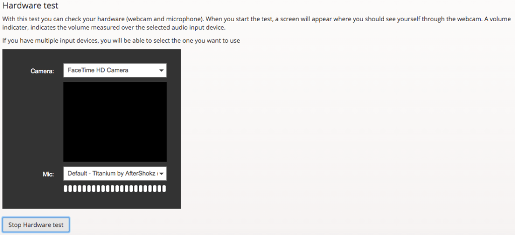 With this test you can check your hardware (webcam and microphone). When you start the test, a screen will appear where you should see yourself through the webcam. A volume indicater, indicates the volume measured over the selected audio input device.