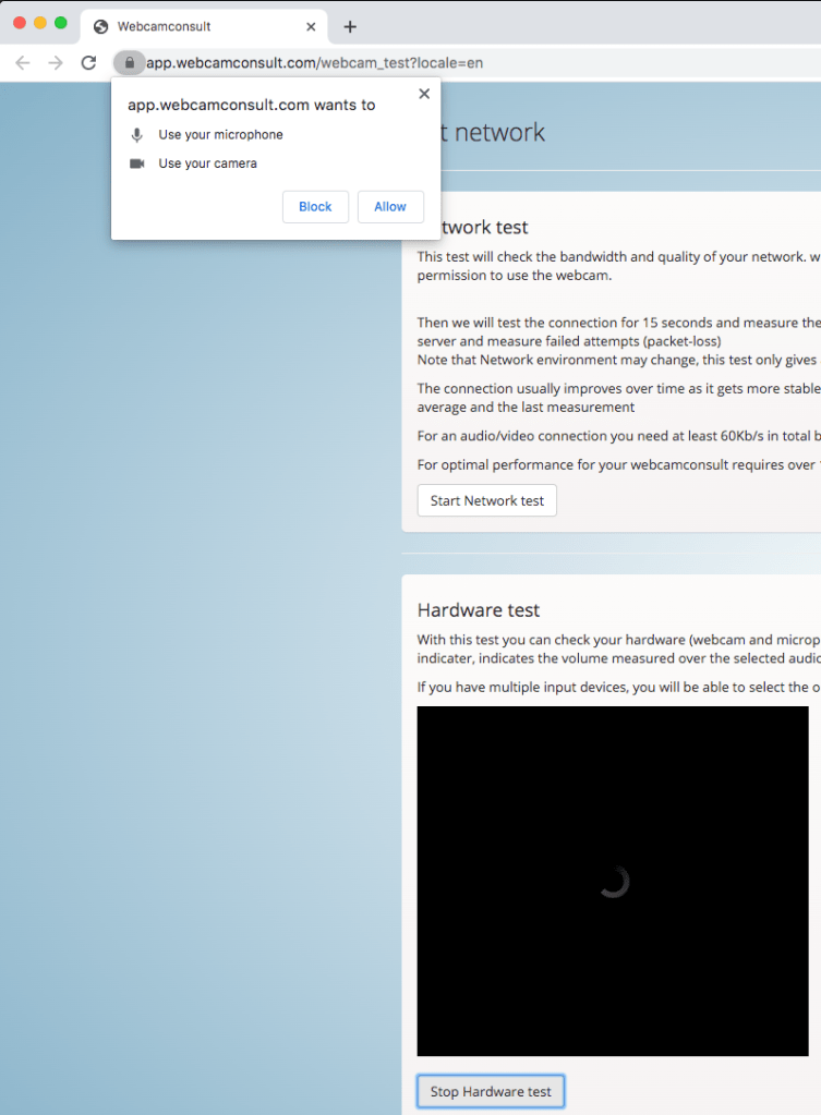 This test will check the bandwidth and quality of your network. when you press ‘start test’, your webcam will be launched and we’ll connect to a test server. You might be asked to give permission to use the webcam.