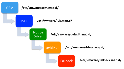 As you can see OEM drivers will have the highest priority and by default Native Drivers will be loaded before “legacy” vmklinux drivers. On a clean installation of ESXi 5.5 you should see at least two of these directories: /etc/vmware/default.map.d/ and /etc/vmware/driver.map.d/ which contains driver map files pertaining to Native Device and “legacy” vmklinux drivers.