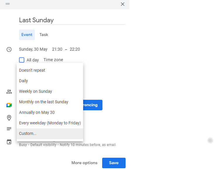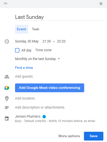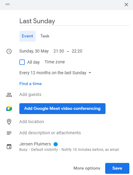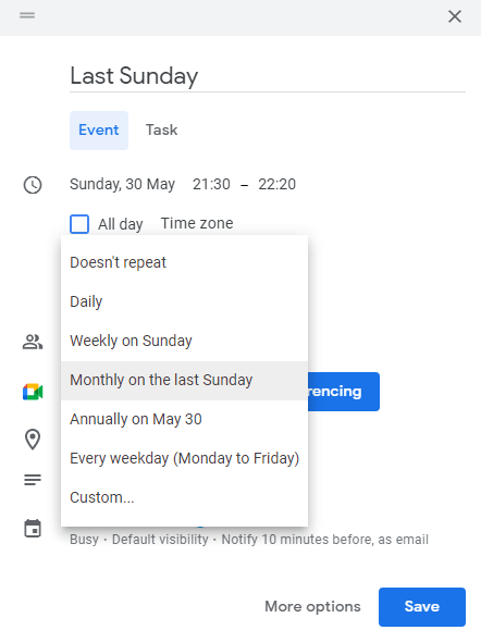 Below is an example while writing this: adding a yearly recurring event on the last Sunday of May (which in 2021 was Sunday the 30th of May).