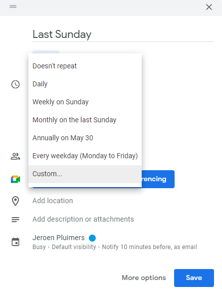 - Click the down arrow next to “Monthly on the last Sunday”, then choose “Custom…”: