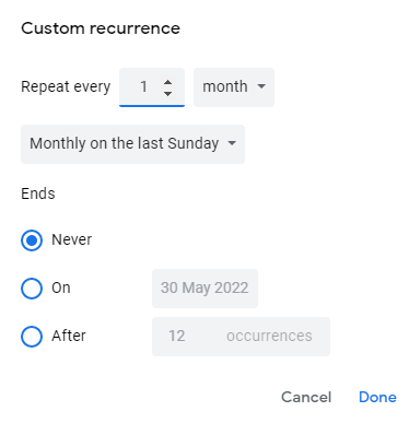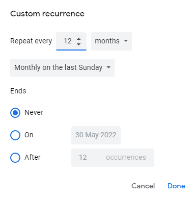 - Now change the “1 months” into “12 months” (if you choose “1 years”, then you loose the “Last Sunday” bit again) and confirm by clicking “Done”: