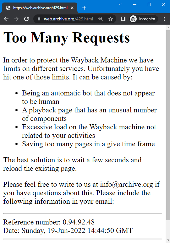 In order to protect the Wayback Machine we have limits on different services. Unfortunately you have hit one of those limits. It can be caused by: