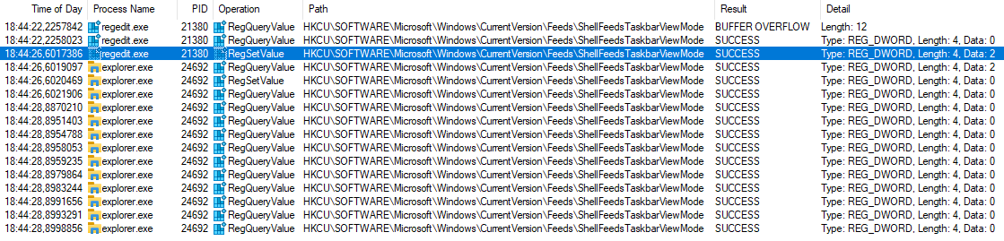 HKEY_CURRENT_USER\Software\Microsoft\Windows\CurrentVersion\Feeds ShellFeedsTaskbarViewMode REG_DWORD 0x0 The operation completed successfully. HKEY_CURRENT_USER\Software\Microsoft\Windows\CurrentVersion\Feeds ShellFeedsTaskbarViewMode REG_DWORD 0x2