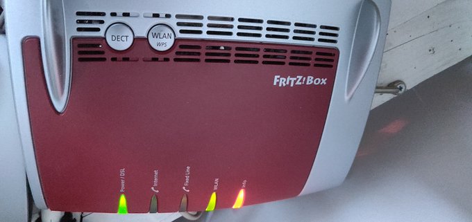 • Fritz!Box has green Power and WLAN LEDs and a red Info LED