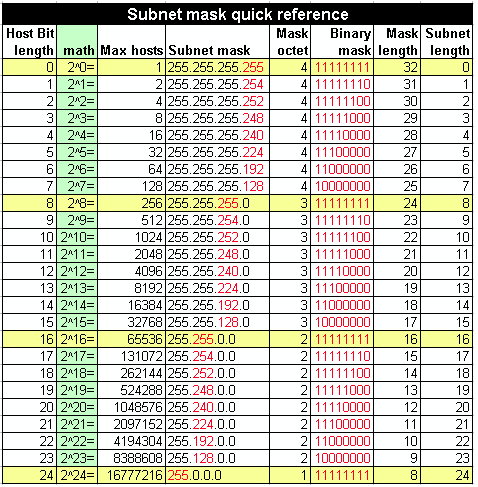 (max hosts)2n a.b.c.d/32 +0.0.0.0 255.255.255.255 4 11111111 1 20 1⁄256 C Host route a.b.c.d/31 +0.0.0.1 255.255.255.254 4 11111110 2 21 1⁄128 C d = 0 … (2n) … 254 Point-to-point links (RFC 3021) a.b.c.d/30 +0.0.0.3 255.255.255.252 4 11111100 4 22 1⁄64 C d = 0 … (4n) … 252 Point-to-point links (glue network) a.b.c.d/29 +0.0.0.7 255.255.255.248 4 11111000 8 23 1⁄32 C d = 0 … (8n) … 248 Smallest multi-host network a.b.c.d/28 +0.0.0.15 255.255.255.240 4 11110000 16 24 1⁄16 C d = 0 … (16n) … 240 Small LAN a.b.c.d/27 +0.0.0.31 255.255.255.224 4 11100000 32 25 ⅛ C d = 0 … (32n) … 224 a.b.c.d/26 +0.0.0.63 255.255.255.192 4 11000000 64 26 ¼ C d = 0, 64, 128, 192 a.b.c.d/25 +0.0.0.127 255.255.255.128 4 10000000 128 27 ½ C d = 0, 128 Large LAN a.b.c.0/24 +0.0.0.255 255.255.255.0 3 11111111 256 28 1 C a.b.c.0/23 +0.0.1.255 255.255.254.0 3 11111110 512 29 2 C c = 0 … (2n) … 254 a.b.c.0/22 +0.0.3.255 255.255.252.0 3 11111100 1,024 210 4 C c = 0 … (4n) … 252 Small business a.b.c.0/21 +0.0.7.255 255.255.248.0 3 11111000 2,048 211 8 C c = 0 … (8n) … 248 Small ISP/ large business a.b.c.0/20 +0.0.15.255 255.255.240.0 3 11110000 4,096 212 16 C c = 0 … (16n) … 240 a.b.c.0/19 +0.0.31.255 255.255.224.0 3 11100000 8,192 213 32 C c = 0 … (32n) … 224 ISP/ large business a.b.c.0/18 +0.0.63.255 255.255.192.0 3 11000000 16,384 214 64 C c = 0, 64, 128, 192 a.b.c.0/17 +0.0.127.255 255.255.128.0 3 10000000 32,768 215 128 C c = 0, 128 a.b.0.0/16 +0.0.255.255 255.255.0.0 2 11111111 65,536 216 256 C = B a.b.0.0/15 +0.1.255.255 255.254.0.0 2 11111110 131,072 217 2 B b = 0 … (2n) … 254 a.b.0.0/14 +0.3.255.255 255.252.0.0 2 11111100 262,144 218 4 B b = 0 … (4n) … 252 a.b.0.0/13 +0.7.255.255 255.248.0.0 2 11111000 524,288 219 8 B b = 0 … (8n) … 248 a.b.0.0/12 +0.15.255.255 255.240.0.0 2 11110000 1,048,576 220 16 B b = 0 … (16n) … 240 a.b.0.0/11 +0.31.255.255 255.224.0.0 2 11100000 2,097,152 221 32 B b = 0 … (32n) … 224 a.b.0.0/10 +0.63.255.255 255.192.0.0 2 11000000 4,194,304 222 64 B b = 0, 64, 128, 192 a.b.0.0/9 +0.127.255.255 255.128.0.0 2 10000000 8,388,608 223 128 B b = 0, 128 a.0.0.0/8 +0.255.255.255 255.0.0.0 1 11111111 16,777,216 224 256 B = A Largest IANA block allocation a.0.0.0/7 +1.255.255.255 254.0.0.0 1 11111110 33,554,432 225 2 A a = 0 … (2n) … 254 a.0.0.0/6 +3.255.255.255 252.0.0.0 1 11111100 67,108,864 226 4 A a = 0 … (4n) … 252 a.0.0.0/5 +7.255.255.255 248.0.0.0 1 11111000 134,217,728 227 8 A a = 0 … (8n) … 248 a.0.0.0/4 +15.255.255.255 240.0.0.0 1 11110000 268,435,456 228 16 A a = 0 … (16n) … 240 a.0.0.0/3 +31.255.255.255 224.0.0.0 1 11100000 536,870,912 229 32 A a = 0 … (32n) … 224 a.0.0.0/2 +63.255.255.255 192.0.0.0 1 11000000 1,073,741,824 230 64 A a = 0, 64, 128, 192 a.0.0.0/1 +127.255.255.255 128.0.0.0 1 10000000 2,147,483,648 231 128 A a = 0, 128 0.0.0.0/0 +255.255.255.255 0.0.0.0 0 00000000 4,294,967,296 232 256 A Entire IPv4 Internet, default route.