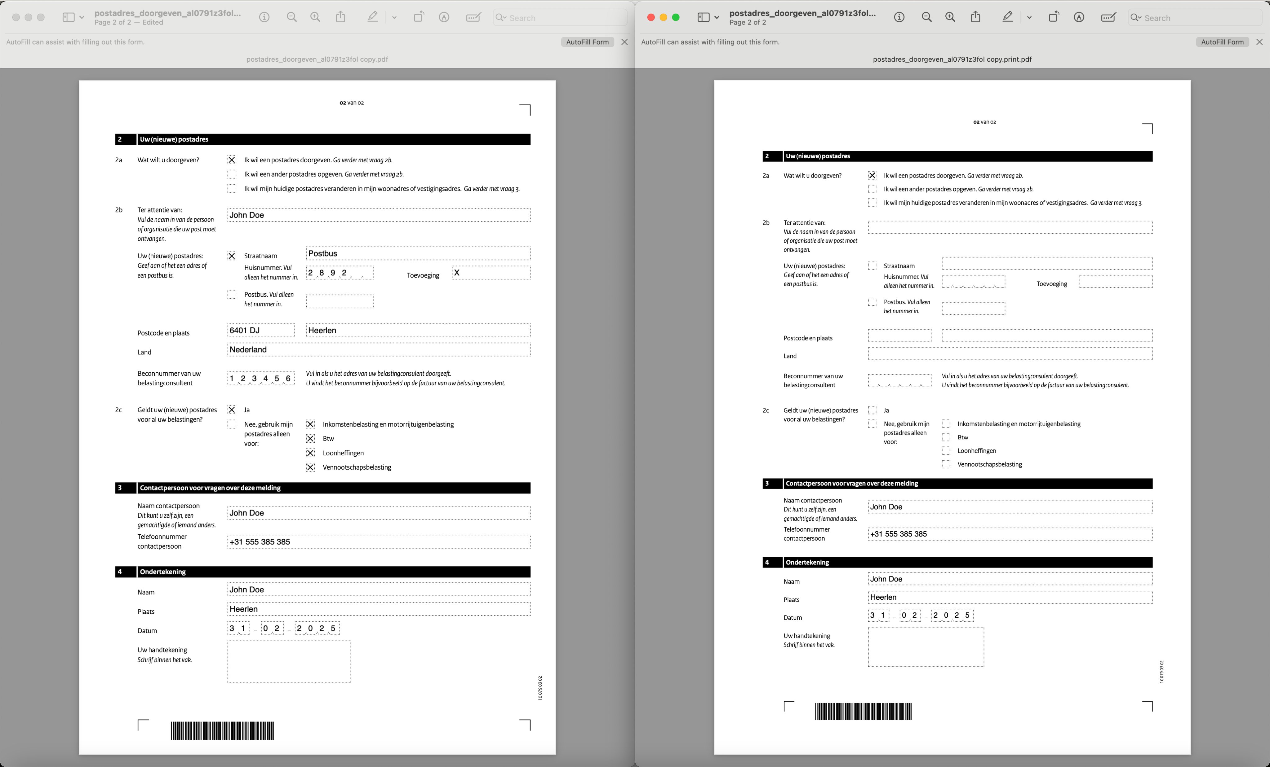 Edit 20250213: let op! Op MacOS met Preview: vul niet het formulier als formulier in, maar gebruik text-annotations voor de tekstvelden. Want anders ben je met printen 80% van je informatie kwijt