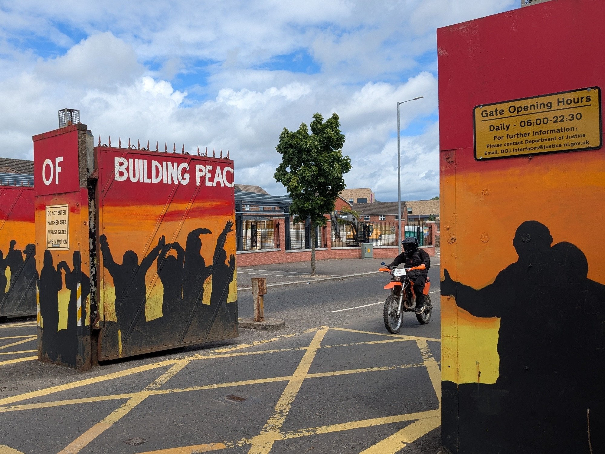 • Peace wall with signs "Do not enter hatched area whilst gates are in motion" and "Gate opening hours Daily - 06:00-22:30 For further information: Please contact Department of Justice Email: DOJ.Interfaces@justice-ni.gov.uk"