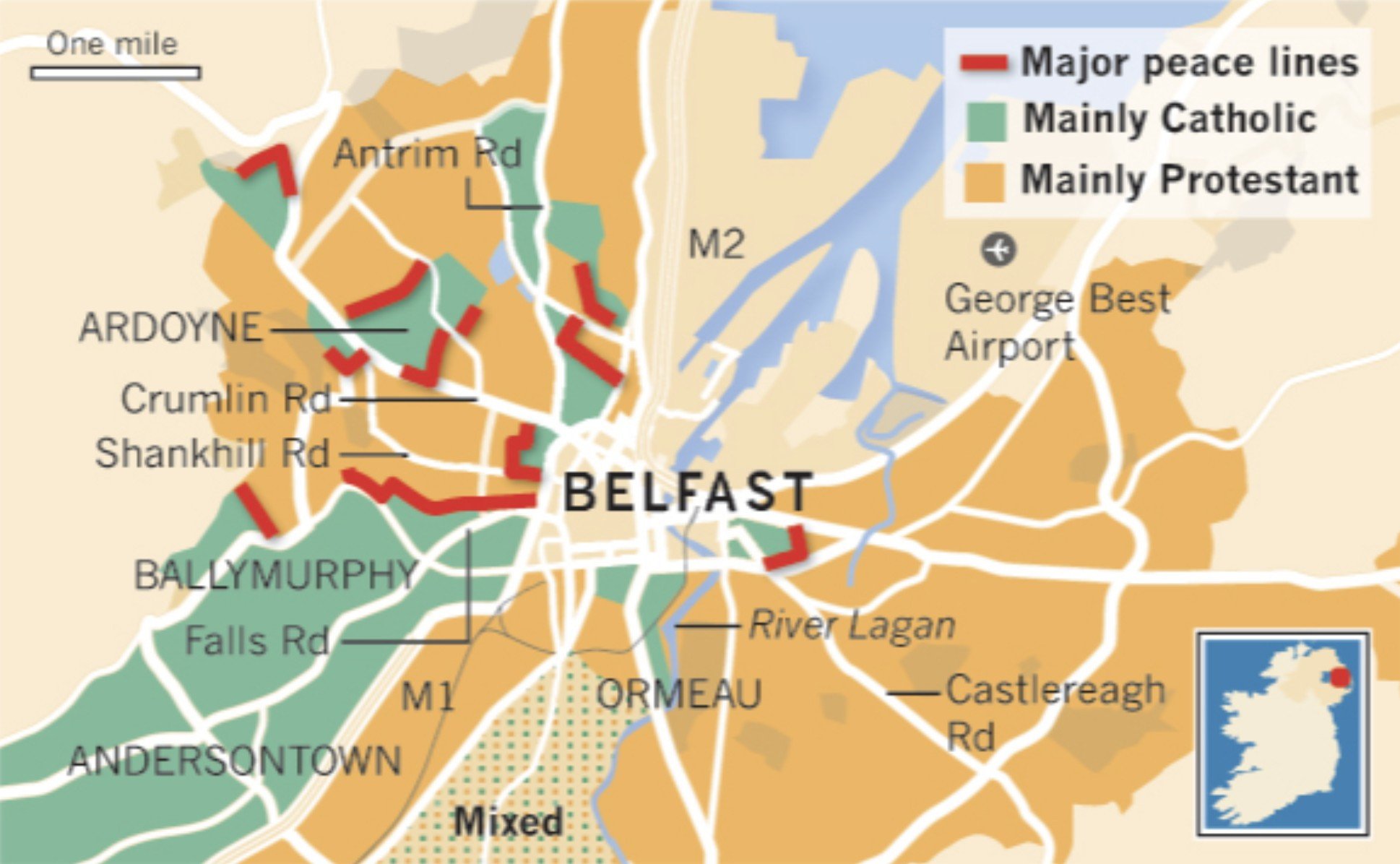 • Belfast map with major roads (white), major peace lines (red), mainly catholic (green), mainly protestant (orange), mixed (beige with green/orange dots), water (blue), other (beige). Marked areas: Antrim Road, Crumlin Road, Shankhill Road, Falls Road, M1, Castlereagh Road, River Lagan, M1, M2, George Best Airport, Ardoyne, Ballymurphy, Andersontown, Ormeau, Belfast.