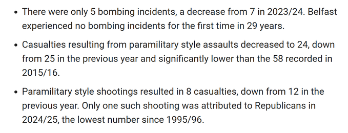 • Paramilitary style shootings resulted in 8 casualties, down from 12 in the previous year. Only one such shooting was attributed to Republicans in 2024/25, the lowest number since 1995/96.