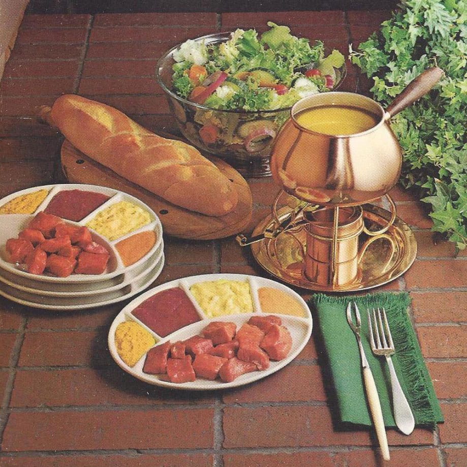 What can my Font do background: oil fondue set with meat, sauces, baguette, salad, cutlery and fondue pan