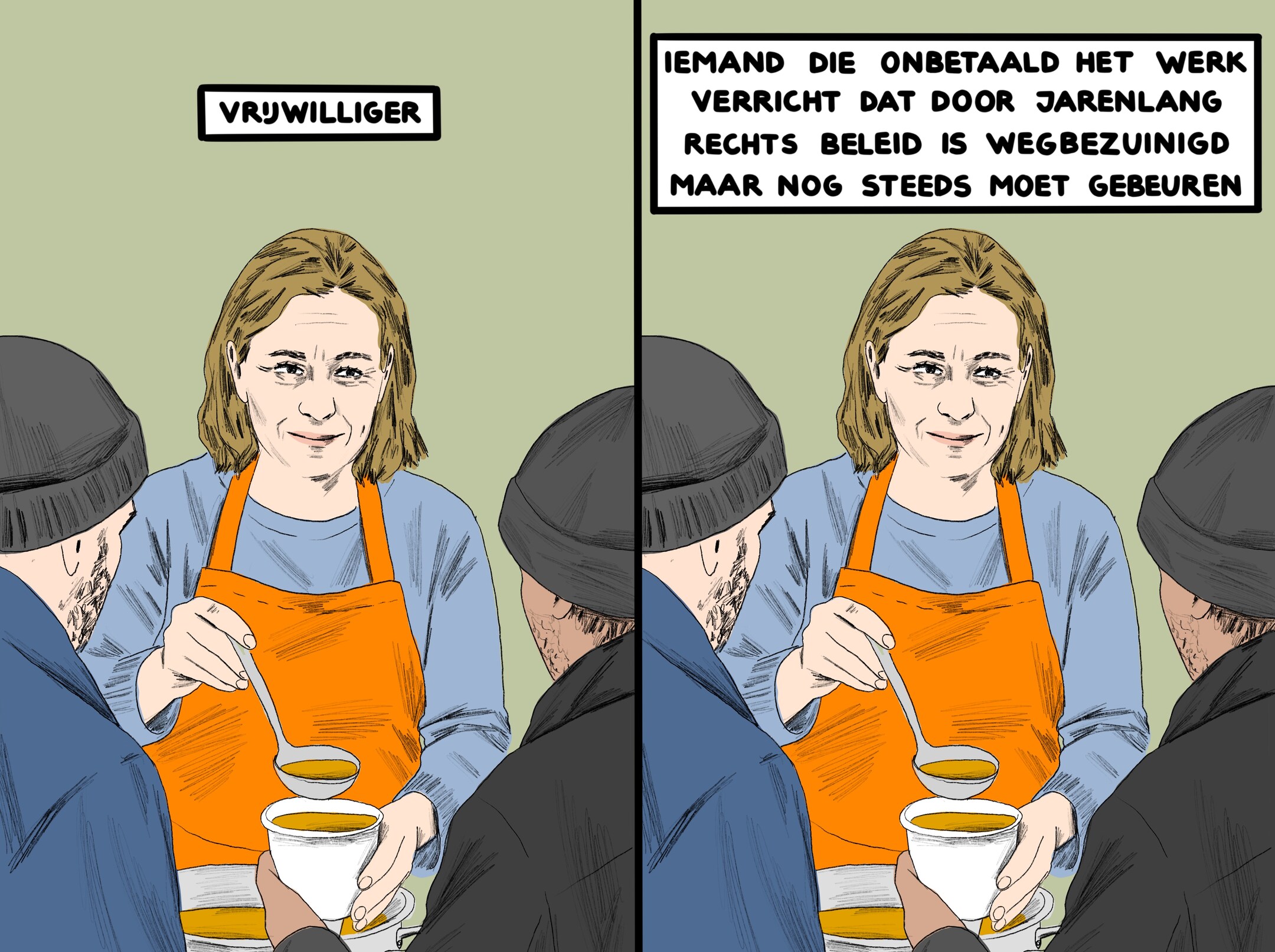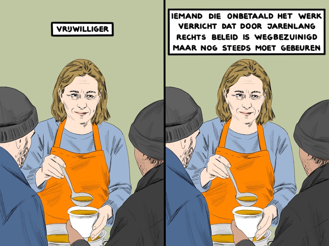 Comic met 2 identieke plaatjes van een getekende vrouw die eten opschept voor 2 mannen met stoppelbaarden en een beanie op Links: Vrijwilliger Rechts: Iemand die onbetaald het werk verricht dat door jarenlang rechts beleid is wegbezuinigd maar nog steeds moet gebeuren
