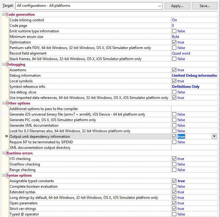 DCC_OutputDependencies: “Project Options” -> “Delphi Compiler” -> “Compiling” -> “Output unit dependency information”