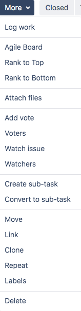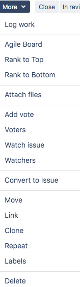 For issue types other than sub-task, the dropdown only has one conversion entry: “convert to sub-task” (a sub-task has only “Convert to Issue”).