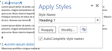 - Then observe the first numbered “Heading 1” now has got the number “1” instead of the “Summary”: