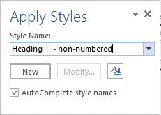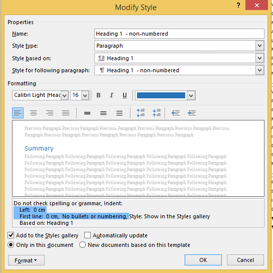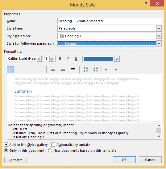 - From there, press the “Modify” button and continue as done with “Heading 1 – non-numbering”: