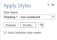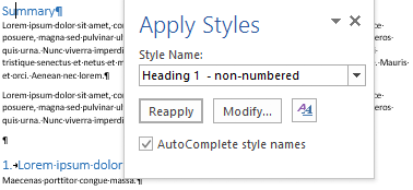 - Mark the “Summary” heading as a new style “Heading 1 – non-numbered”: