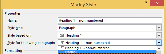 - Unlike the “Heading 1” style, the “Style for following paragraphs” is wrong: it needs to be